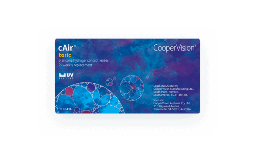 Benefits of CooperVision's cAir™ Toric contact lenses: CooperVision's cAir™ technology helps to lock moisture in for comfortable wear. 2-weekly lenses offer great value with regular replacement. Toric design optimised for astigmatism provides clear stable vision. UV blocking helps to protect your eyes from potentially harmful rays. Breathable lenses that keep your eyes irritation-free. Silicone hydrogel lenses fit securely for clear and crisp vision. 6 pack. CooperVision's cAir™ designed for two weekly lens wearers with dry eyes. The Optimised Toric Lens Geometry™ enables reliable and clear vision. Aquaform® Comfort Science™ keeps eyes moist and comfortable and ideal for dry eyes. Has all the benefits of silicone hydrogel, with enhanced water content and natural wetting-ability, this means cAir is a high performing, comfortable lens for regular lens users. Ideal for Australian lifestyle, cAir contact lenses help block more than 90% harmful UV-A and 99% UV-B rays, thanks to Class 1 UV protection. cAir Toric lenses offer you the freedom you are looking for.